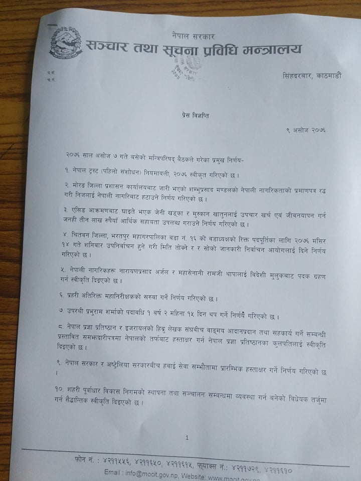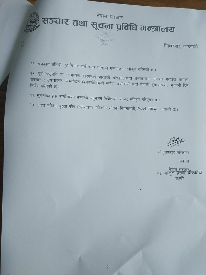 काठमाडौं । असोज ७ गते बसेको मन्त्रीपरिषदको बैठकले बिभिन्न १४ वटा निर्णय गरेको छ । सञ्चार तथा सूचना प्रविधी मन्त्रालयले प्रेस विज्ञप्ती जारी गर्दै त्यस्ता निर्णयहरु सार्वजनिक गरेको हो ।