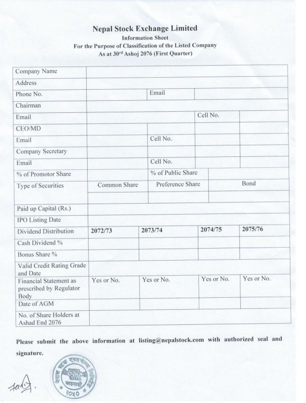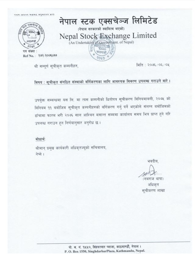 काठमाडौं । नेपाल स्टक एक्सचेन्ज (नेप्से)ले सुचिकृत संगठित संस्थाको वर्गीकरणका लागी आवस्यक विवरण उपलब्ध गराउनका लागी माग गरेको छ । नेप्सेले एक सुचना जारी गर्दै असोज मसान्तसम्म यी विवरण उपलब्ध गराउन अनुरोध गरेको हाे ।