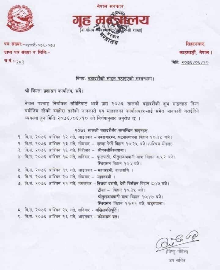 काठमाडौं– बडादशैं आइतबारदेखि सुरु हुँदै छ । यही क्रममा गृहमन्त्रालयले पञ्चांग निर्णायक समितिले निकालेको शुभराइतबारे जानकारी गराएको छ ।