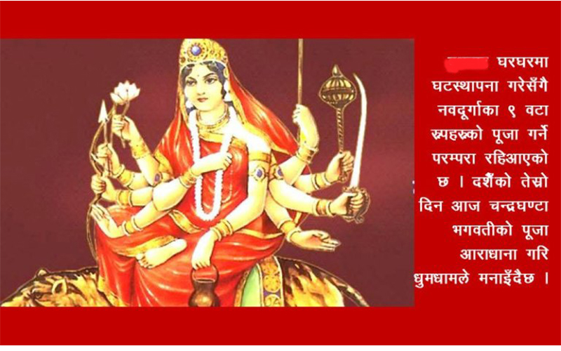 काठमाडौं । नवरात्री अर्थात् बडा दशैँको तेस्रो दिन मंगलबार चन्द्रघण्टाको पूजा गरी मनाइँदै छ । घटस्थापना गरेसँगै शुरुभएको दशैंको आज तेस्रो दिन चन्द्रघण्टा भगवतीको पूजा आराधाना गरि मनाइने प्रचलन छ । नवरानत्रको तेस्रो दिन चन्द्रघण्टा नामले दूर्गा माताको पूजागर्ने गरिन्छ । देवीको मस्तकमा चन्द्राकार घण्ट सुसोभित भएका कारण उनलाई चन्द्रघण्टा भनिएको हो । यिनलाई बिर रसको अपूर्व शक्ति मानिएको छ । चन्द्रघण्टा देवीको रुपको पूजाले मनुष्यले राक्षसी तथा भुत प्रेत शक्तिबाट उन्मुक्ति पाउछ भनिएको छ ।