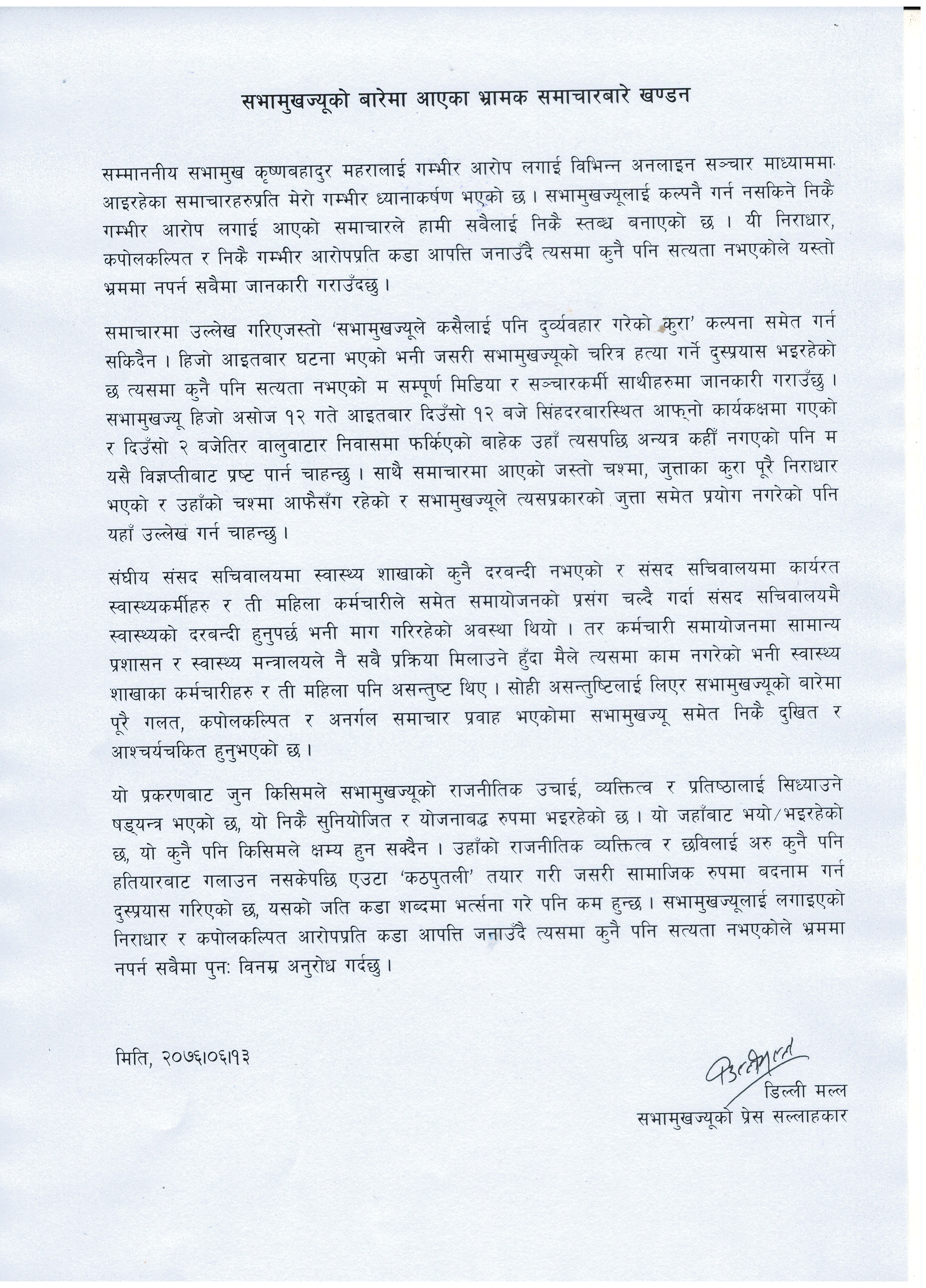 ‘सम्माननीय सभामुख कृष्णबहादुर महरालाई गम्भीर आरोप लगाई विभिन्न अनलाइन सञ्चार माध्याममा आइरहेका समाचारहरुप्रति मेरो गम्भीर ध्यानाकर्षण भएको छ । सभामुखज्यूलाई कल्पनै गर्न नसकिने निकै गम्भीर आरोप लगाई आएको समाचारले हामी सबैलाई निकै स्तब्ध बनाएको छ । यी निराधार, कपोलकल्पित र निकै गम्भीर आरोपप्रति कडा आपत्ति जनाउँदै त्यसमा कुनै पनि सत्यता नभएकोले यस्तो भ्रममा नपर्न सबैमा जानकारी गराउँदछु’ सभामुखका प्रेस सल्लाहकार डिल्ली मल्ल्ले जारी गरेको खण्डन विज्ञप्तिमा भनिएको छ ।