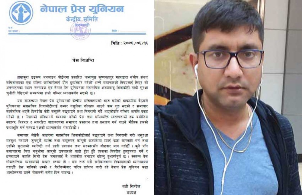 यस सम्बन्धमा नेपाल प्रेस युनियनको केन्द्रीय सचिवालयको आज बसेको आकस्मीक बैठकले युनियनका महासचिव शिवाकोटीलाई नम्बर नखुलेका फोनहरु आउने क्रम शुरु भएको र समाचार सार्वजनिक भएकै दिनदेखि केही समूहले पछ्याउने तथा निगरानी गर्दै आएकोप्रति गम्भिर आपत्ति प्रकट गरेको छ । नेपालको संविधानले व्यवस्था गरेको प्रेस तथा अभिव्यक्ति स्वतन्त्रताको हक बमोजिम स्वतन्त्र, निश्पक्ष र भयरहित वातावरणमा समाचार प्रकाशन तथा प्रसारण गर्न पाउने मौलिक हकको प्रत्याभूति गर्न सम्बद्ध पक्षको ध्यानाकर्षण गराउँदछौ ।