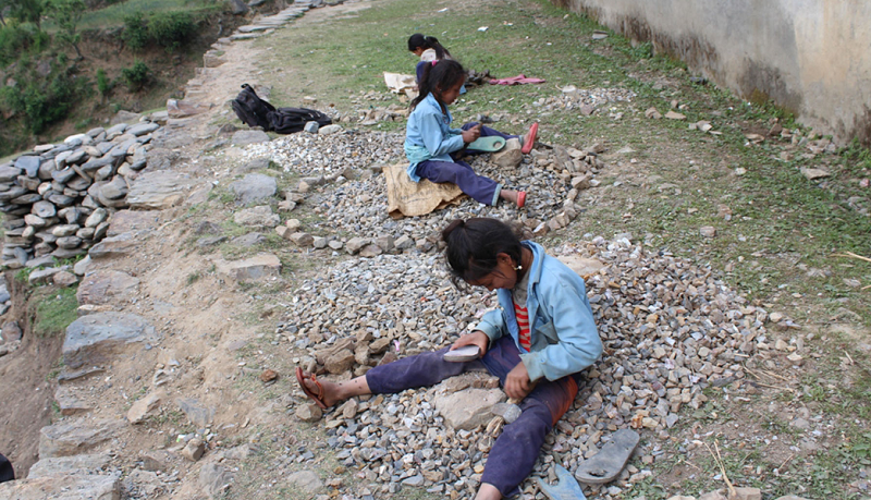 सयौँ व्यक्ति यही बाटो हुँदै हिँड्ने गर्दछन्, तर यहाँका दलित र जनजाति समुदायका बालबालिका भने हतौडा हातमा लिएर गिट्टीको खातमा दशैँका लागि खर्च जुटाउने उपाय खौज्दैछन् । रुकुम पश्चिम आठविसकोट नगरपालिका–११ रिटा गाउँ नजीकै त्रिभुवन मावि दल्लीमा कक्षा ६ मा पढ्ने सावित्रा घर्ती सडकमै गिट्टी कुट्न थालेको पाँच दिन बितेको छ । घरमा बाबा नभएका कारण आमाले कमाएको रकमले घर खर्च नटरेपछि बाध्य भएर गिट्टी कुट्न लागेको उनले बताइन् ।
