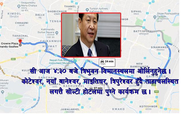 चिनियाँ राष्ट्रपति सी शनिवार दिउँसो करिब ४ ३० बजे मा त्रिभुवन अन्तर्राष्ट्रिय विमानस्थलमा ओर्लिनुहुनेछ । विमानस्थलबाट कोटेश्वर, नयाँ बानेश्वर, माइतिघर, त्रिपुरेश्वर हुँदै ताहाचलस्थित सोल्टी होटलमा पुग्ने कार्यक्रम छ ।