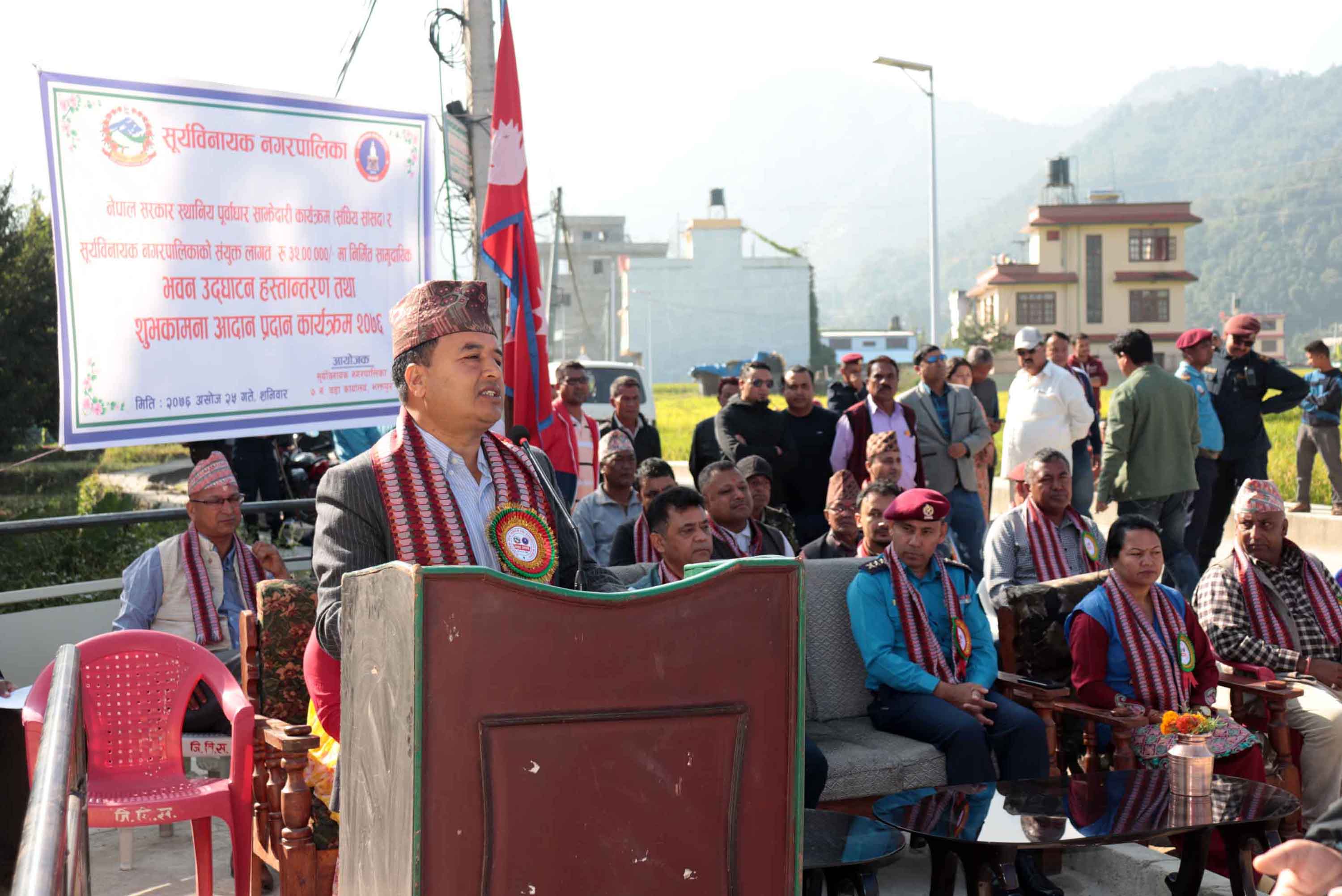 सूर्यविनायक नगरपालिका–७ कार्यालयले आज गुण्डु चोकमा निर्माण गरेको सामुदायिक भवनको उद्घाटन कार्यक्रममा उहाँले विश्वमै चीनले गरेको चामत्कारिक विकासबाट नेपालले पनि सिक्नुपर्ने औँल्याउँदै यो भ्रमणबाट नेपालले धेरै लाभ लिनसक्ने भनाइ राख्नुभयो ।