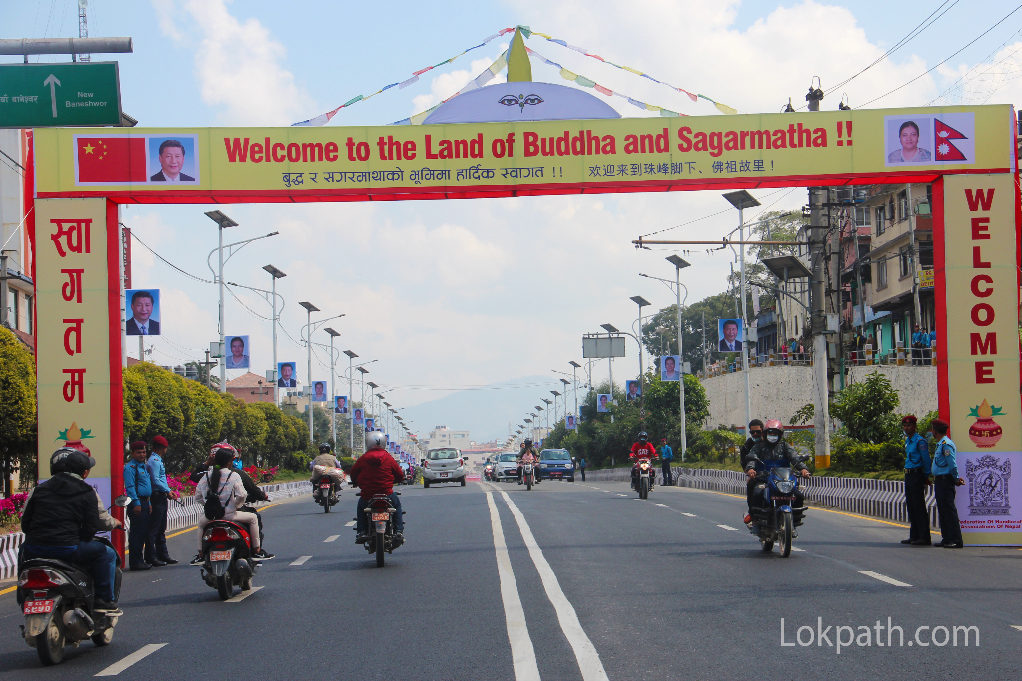 सडक किनारामा राष्ट्रपति विद्यादेवी भण्डारी र समकक्षी सी का तस्वीर देख्न सकिन्छ । चिनियाँ राष्ट्रपतिको स्वागतका लागि काठमाडौं तम्तयार छ ।