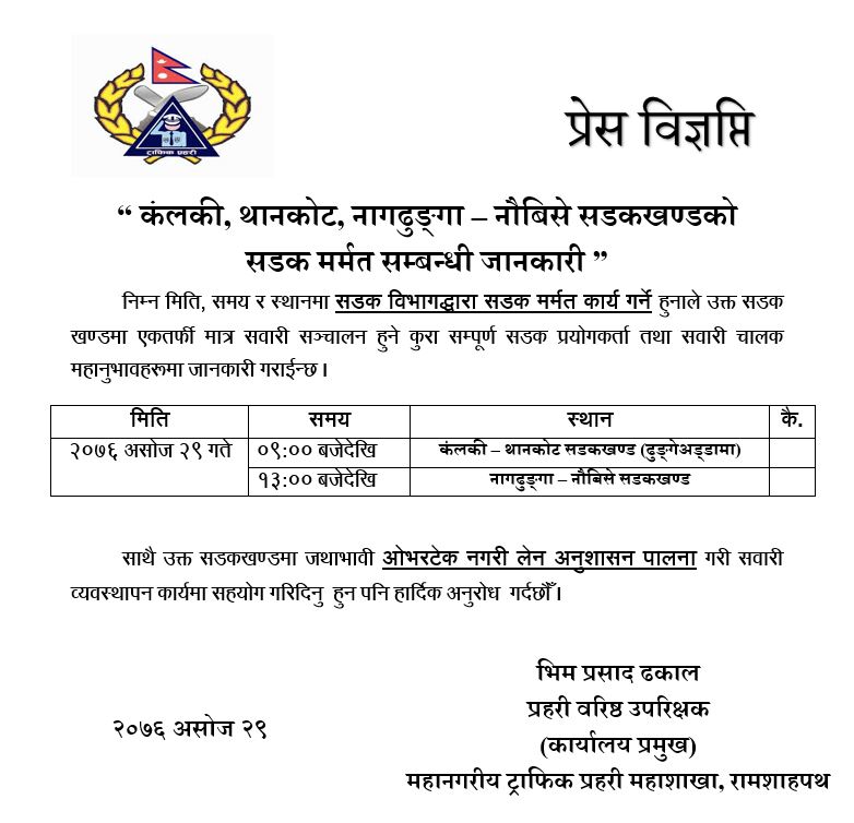 काठमाडौं – तपाई कलंकी थानकोट नागढुंगा नौबिसे सडकखण्डमा यात्रा गर्दै हुनुहुन्छ ? सचेत हुनुहोस् । ट्राफिक प्रहरीले कलङ्की–थानकोट र नागढुङ्गा–नौबिसे सडकखण्ड मर्मत कार्य भएकाले ट्राफिक व्यवस्थापनमा सहयोग गर्न सडक प्रयोगकर्तालाई आग्रह गर्दै एक विज्ञप्ती जारी गरेको छ । सामाजिक सञ्जाल फेसबुक पेज मार्फत ट्राफिक प्रहरीले भनेको छ, यो बाटो मर्मतसम्भारको काम भइरहेको कारण एकतर्फि रुपमा मात्रै सञ्चालन हुनेछ । महानगरीय ट्राफिक प्रहरी महाशाखाले आज एक विज्ञप्ति जारी गरी सडक विभागद्वारा सडक मर्मत कार्य गर्ने भएकाले सडक एकतर्फी मात्र सञ्चालन हुने भएकाले ट्राफिक व्यवस्थापनमा सहयोग गर्न आग्रह समेत गरेको छ । पृथ्वी राजमार्ग अन्तर्गत पर्ने नागढुंगा नौबिसे सडक अहिले निकै बिग्रेको छ । बिचसडकमा ठूला खाल्डाखुल्डी छन् ।