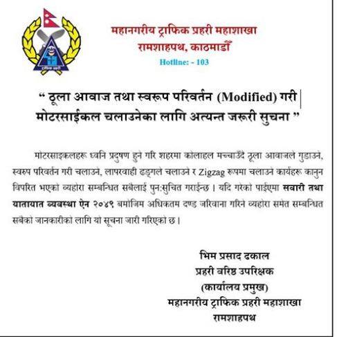 यदि त्यसो हो भने तपाईले तत्काल ट्राफिक प्रहरीको यो सूचना पढ्नुहोस् । हो, ट्राफिक प्रहरीले ठूला आवाज तथा स्वरुप परिवर्तन गरी मोटरसाईकल चलाउनेका लागि अत्यन्त जरुरी सूचना भन्दै जारी गरेको एक नोटिसमा लेखिएको छ यदि यस्तो किसिमको सवारीमा हुँईकिनुभएको छ भने सवारी तथा यातायात व्यवस्था ऐन २०४९ बमोजिम अधिकतम दण्ड जरीवाना गरिनेछ ।