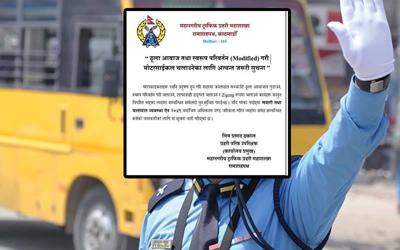 ठूलो आवाज तथा मोडिफाई गरिएको बाईक हाँक्ने गर्नुभएको छ ? ट्राफिकको यो सूचना पढ्नुहोस्