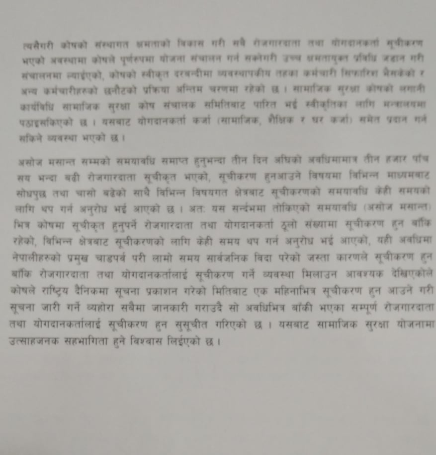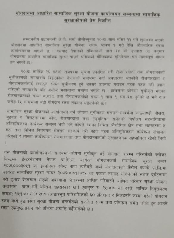 काठमाडौं । योगदानमा आधारित सामाजिक सुरक्षा योजना कार्यान्वयनका सम्बन्धमा सामाजिक सुरक्षा कोषले विज्ञेप्ती निकालेको छ । २०७५ साल मंसिर ११ गते सुभारम्भ भएको उक्त योजना २०७६ साउन १ गतेबाट कार्यान्वयनमा ल्याइएको छ । साथै उक्त योजना कार्यान्वयनको लागी काठमाडौं , पोखरा, बुटवल तथा बिराटनगरमा कोष, टे्रडयनियन तथा रोजगारदाता समेतको त्रिपक्षिय सहभागितामा अभिमुखीकरण कार्यक्रम सम्पन्न भएको थियो ।