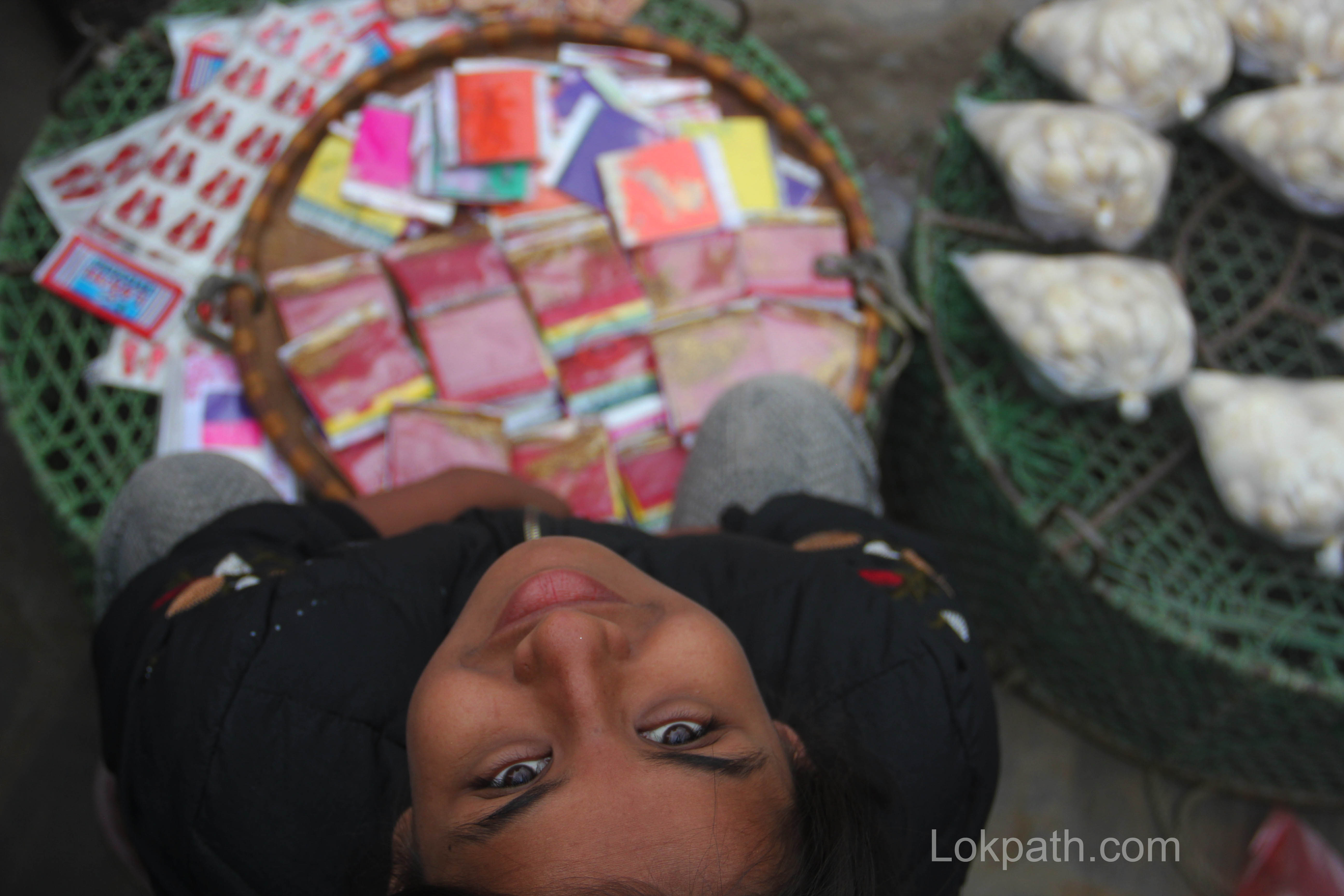 काठमाडौं । ‘२० रुपैयाँ मात्र हो दिदी लग्नुस् न !’ असन चोकमा सप्तरङ्गी टिका बेच्न बसेकी १३ वर्षीया बिनिता मुसुक्क मुस्कुराइन् ।