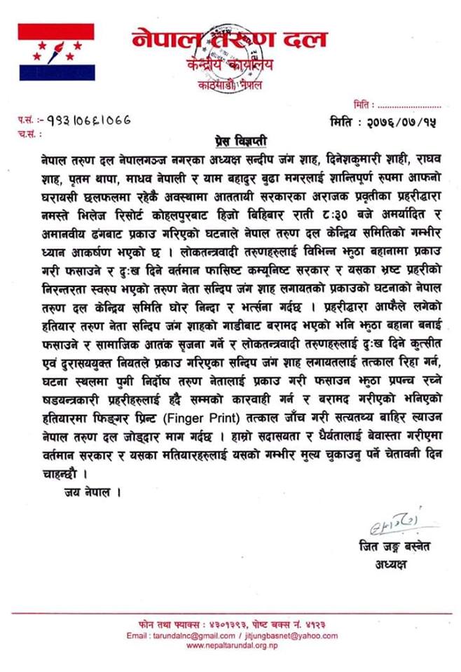 लोकतन्त्रवादी तरुणहरुलाई विभिन्न झुटा बहानामा पक्राउ गरी फसाउने र दुःख दिने नियतले बिहीबार राति पक्राउ गरिएको भन्दै तरुण दलले सो घटनाको निन्दा गरेको छ । तरुण दलले प्रहरीद्वारा आफैँले लगेको हतियार तरुण नेता सन्दीपजङ्ग शाहको गाडीबाट बरामद भएको भनी झुटो बहाना बनाई फसाउने र सामाजिक आतङ्क सिर्जना गर्ने नियतले पक्राउ गरिएको आरोप लगाएको छ ।