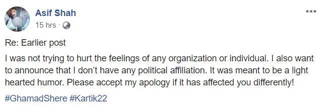 यही पोस्टलाई आधार बनाउँदै नेपाली काङ्ग्रेसका भातृ संगठन नेविसंघ र तरुण दलले आसिफ शाहले सार्वजनिक रुपमा माफी माग्नु पर्ने भन्दै विरोध जनाएका छन् । त्यसैले उनले यो विषयलाई लिएर निकै तनाव झेल्नुपर्यो । पछि उनले आफ्नो कारणबाट गल्ती भएको भन्दै माफि मागेको अर्को पोस्ट पनि गर्नुपरेको थियो । भन्छन् नि दुख पाईस् मंगले आफ्नै ढंगले । यो कुरा बेलैमा बुझेको भए आसिफलाई यो फसाद् पर्दैनथ्यो कि ?