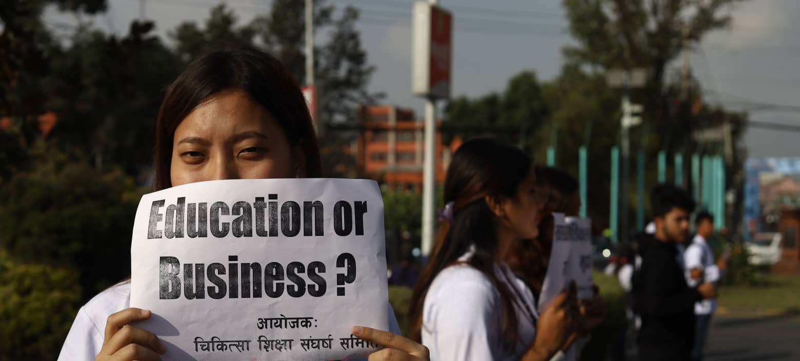 चिकित्सा शिक्षा संघर्ष समितिका संयोजक प्रकाश चन्दको नेतृत्वमा भएको प्रदर्शनमा सहभागीहरुले मडिकल कलेजहरुले असुल्दै आएको अतिरिक्त शुल्क तत्काल फिर्ता गर्न माग गरे ।