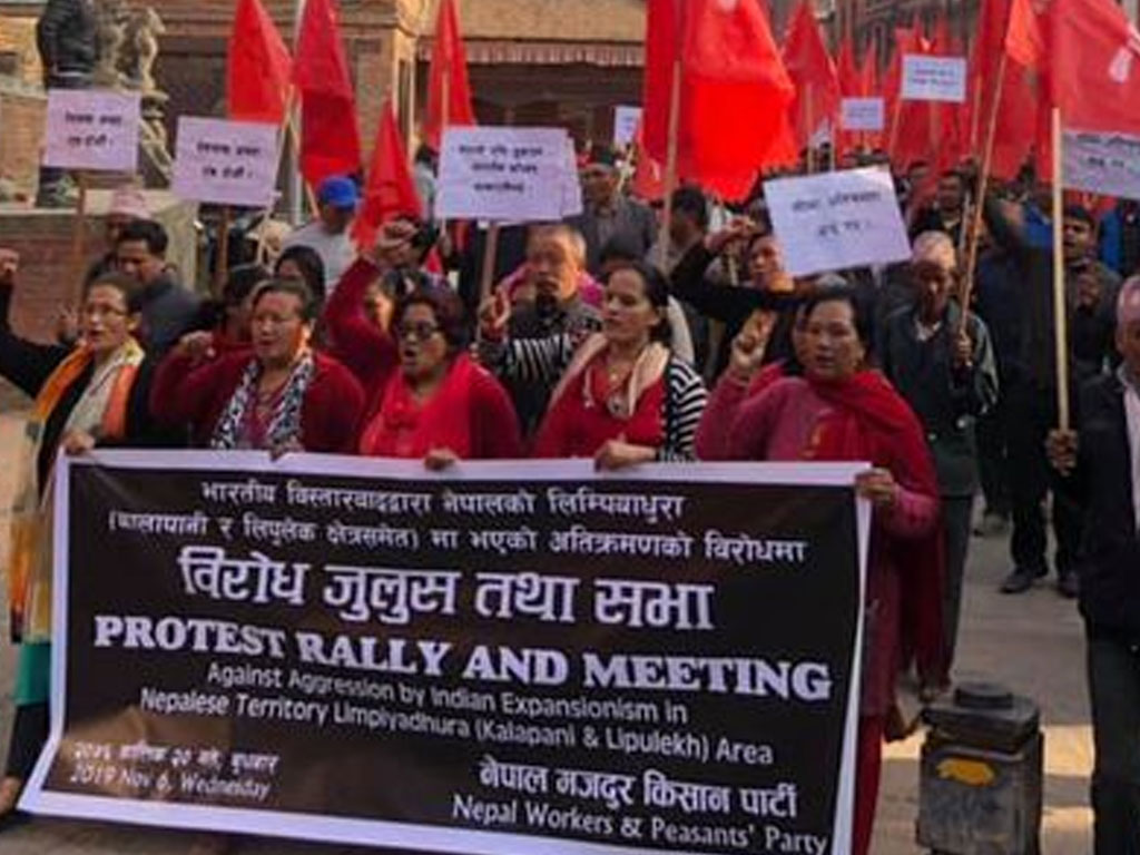 काठमाडौं । नेपाली सीमा अतिक्रमण गरी भारतले जारी गरेको नक्साको विरोध गर्दै नेपाल मजदूर किसान पार्टीले विरोध ¥याली प्रदर्शन गरेको छ । नेमकिपाले आज भक्तपुरको कमलबिनायकबाट शुरु गरेको विरोध -याली भक्तपुर नगर क्षेत्रको विभिन्नस्थान परिक्रमा गरी सूर्यविनायक चोकमा पुगेर विरोधसभामा परिणत भएको थियो ।
