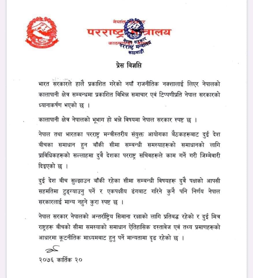 परराष्ट्र मन्त्रालय बुधबार एक विज्ञप्ती जारी गर्दे कालापनी क्षेत्र नेपालको भूभाग हो भने विषयमा नेपाल सरकार स्पष्ट रहेको बताएको छ ।