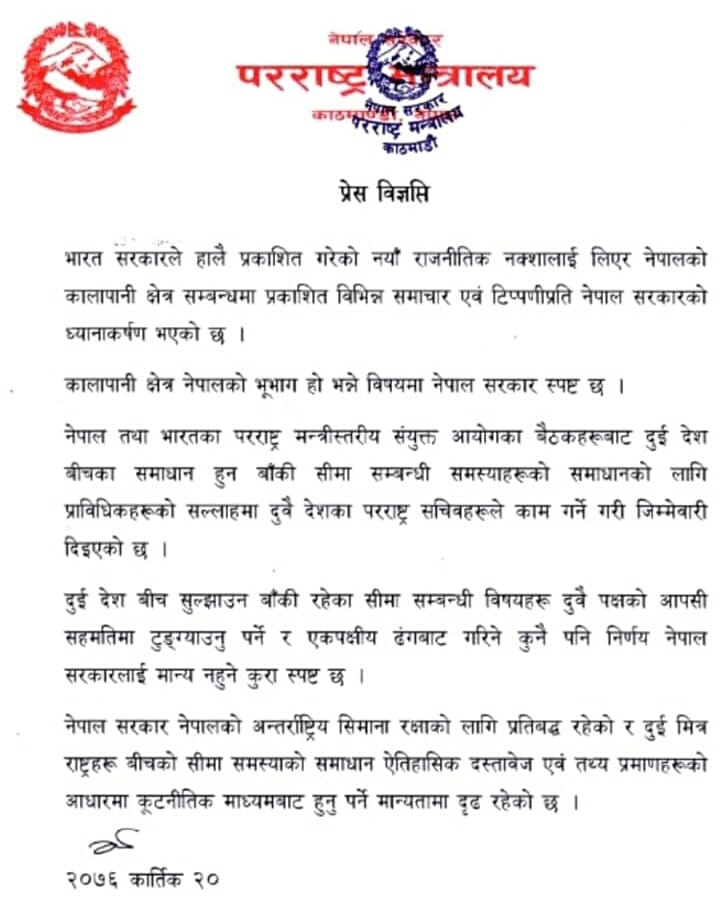 कालापानी क्षेत्र नेपालको भूभाग हो भन्दै परराष्ट्रले निकाल्यो यस्तो विज्ञप्ती !