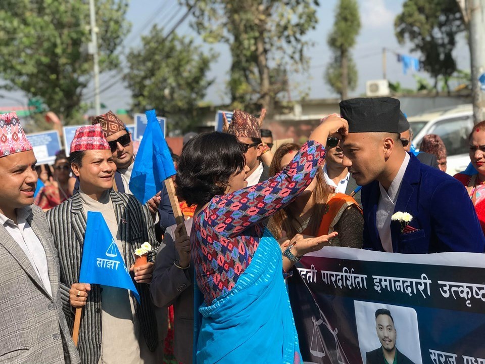 राष्ट्रिय झन्डा, पार्टीको झन्डा र सांकेतिक तराजु सहितको र्यालीको यात्रु तथा सवारी साधनलाइ सहजकासाथ आवतजावत गराएको थियो । निर्वाचन अधिकृतको कार्यालयमा प्रवेश गर्नु अघि पार्टीकी नेता समीक्षा बास्कोटाले उमेदवार सुरज प्रधानलाइ माटोको टिका लगाएर बिजयीको शुभकामना दिएको थिए । प्रधान वातावरण अभियन्ता उद्धमी हुन् ।