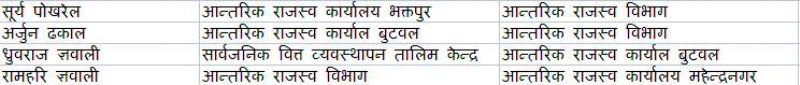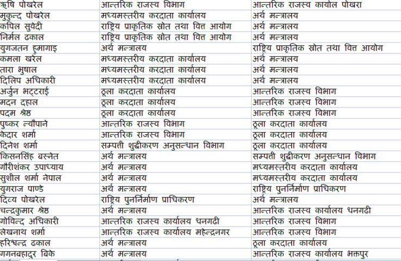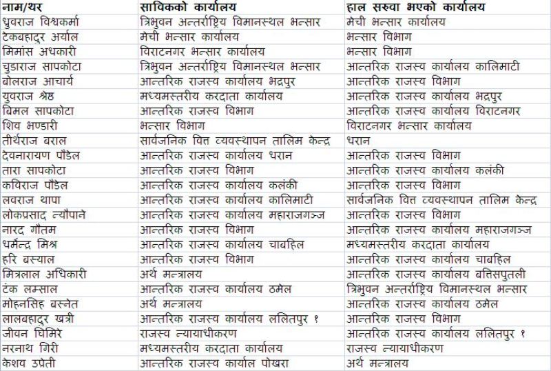 काठमाडौंभित्र कलंकी, कालिमाटी, बत्तिसपुतली, महाराजगन्ज र चावहिलका कर कार्यालय प्रमुखको सरुवा भएका छन्। ललितपुर कर कार्यालयका प्रमुखको विभागमा सरुवा भएको छ। आन्तरिक राजस्व कार्यालय पोखराका प्रमुख पनि विभागमा तानिएका छन्। आन्तरिक राजस्वतर्फ भद्रपुर, धरान, धनगढी, कन्चनपुर लगायतका कार्यालय प्रमुखको सरुवा भएको अर्थमन्त्रालयले जनाएको छ ।