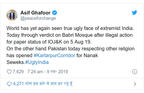 पाकिस्तानी सेनाका प्रवक्ता आसिफ गफूरले ट्वीटमार्फत् भने, ‘संसारले पुनः एकपटक अतिवादी भारतको वास्तविक अनुहार देखेको छ । पाँच अगस्टमा कश्मीरको भारतले संवैधानिक दर्जा समाप्त गर्यो र आज बाबरी मस्जिदबारे निर्णय आयो । अर्कोतर्फ पाकिस्तानले अन्य धर्मको आदर गर्दै गुरु नानकका सेवकका लागि करतारपुर करिडोर खोलेको छ ।’