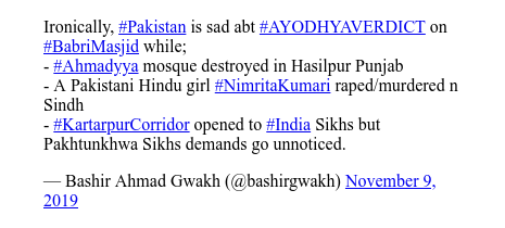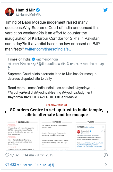 पाकिस्तानका वरिष्ठ पत्रकार हामिद मीरले पनि ट्वीटमा भने, ‘बाबरी मस्जिदमा निर्णय आएपछि विभिन्न प्रश्न तेर्सिएका छन् । भारतको सर्वोच्च अदालतले यो हप्ता किन निर्णय सुनायो ? के पाकिस्तानले सिखका लागि करतारपुरम जे गरे त्यो प्रतिक्रिया स्वरुप यो निर्णय गरिएको हो ? यो निर्णय कानूनको आधारमा गरिएको हो वा बिजेपीको घोषणापत्रको आधारमा ?’