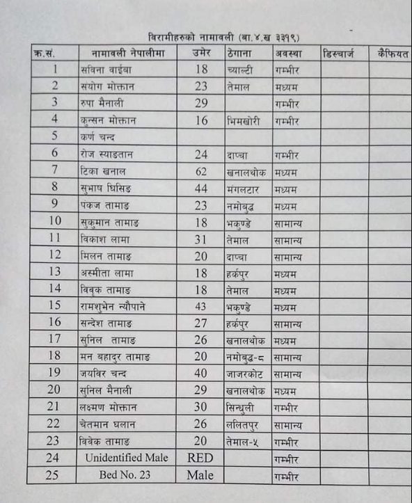 घाइतेहरुको धुलिखेल अस्पताल, नर्भिक, भेनस, वि.एम वि र ट्रमा सेन्टरमा उपचार भएको प्रहरी जनाएको छ ।