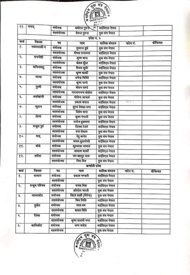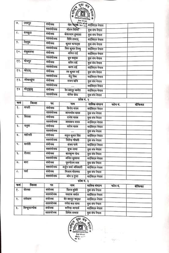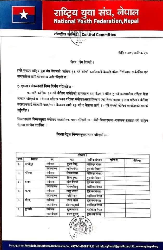कात्तिक १६ गते बसेको बैठकका निर्णय सार्वजनिक गर्दै युवा सङ्घले जिल्ला संयोजक र सहसंयोजक टुंगो लगाएको बताएको छ ।