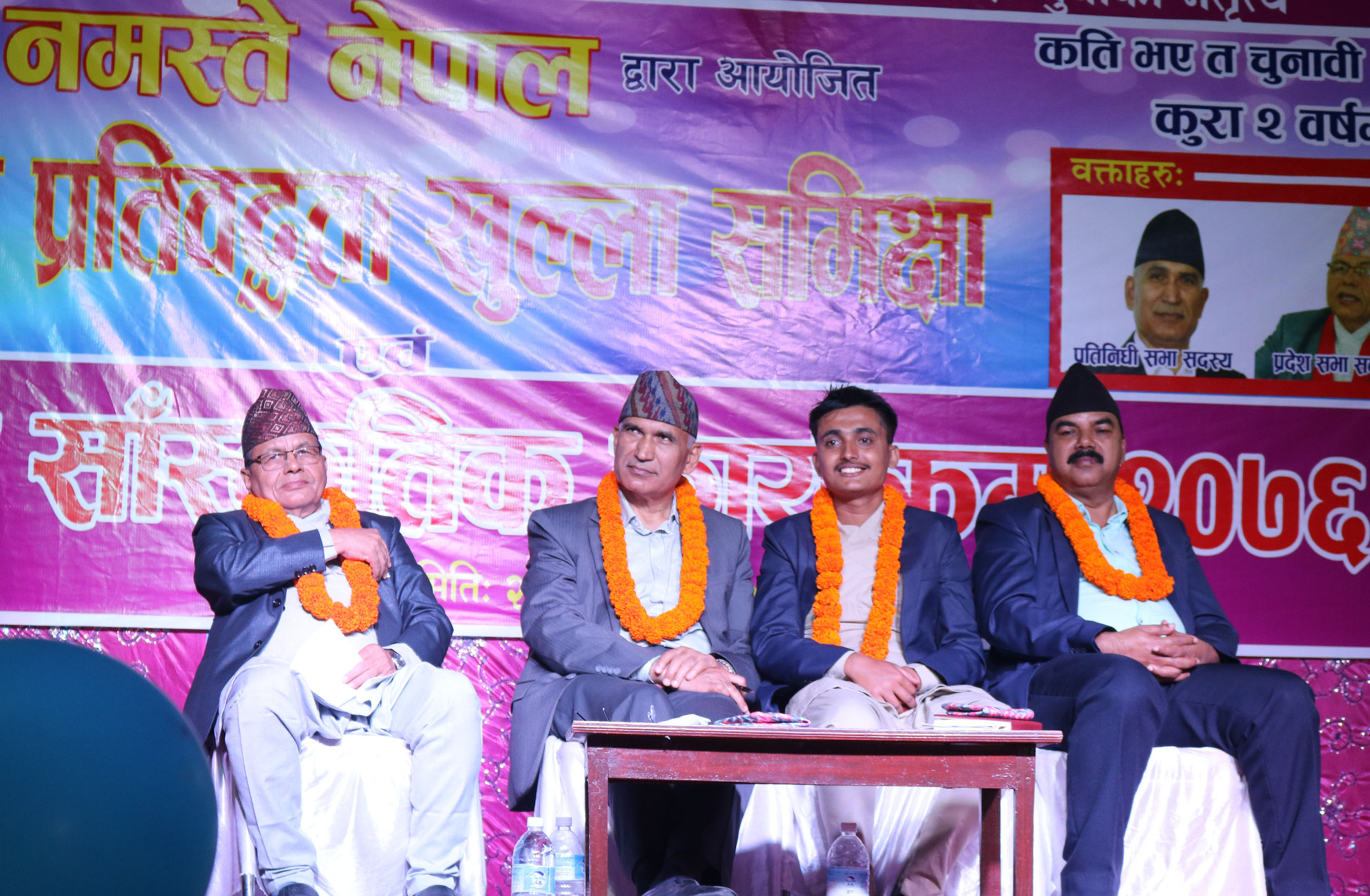 नमस्ते नेपाल नामक संस्थाले बुधबार साँझ शङ्करनगरमा आयोजना गरेको कार्यक्रममा नेपाल कम्युनिष्ट पार्टीका महासचिव तथा रुपन्देही क्षेत्र नं– २ का सांसद विष्णु पौडेल, क्षेत्र नं २ का प्रदेशसभा सदस्य लीला गिरी र तिलोत्तमा नगरपालिकाका प्रमुख वासुदेव घिमिरेलाई निम्ता गरिएको थियो ।