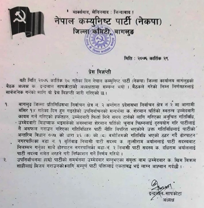 नेकपाले शुक्रबार तुलसीरामलाई पार्टी सदस्यबाट निलम्बन र दधिरामलाई पार्टी सदस्य नरहने गरी निश्कासन गरेको जिल्ला अध्यक्ष इन्द्रलाल सापकोटाले जारी प्रेस विज्ञप्तिमा जनाइएको छ । अहिले पनि शेरमानको चुनाव चिह्न टोपी बनाएर प्रचार प्रसारमा लागेपछि निश्कासन गरिएको विज्ञप्तिमा जनाइएको छ ।