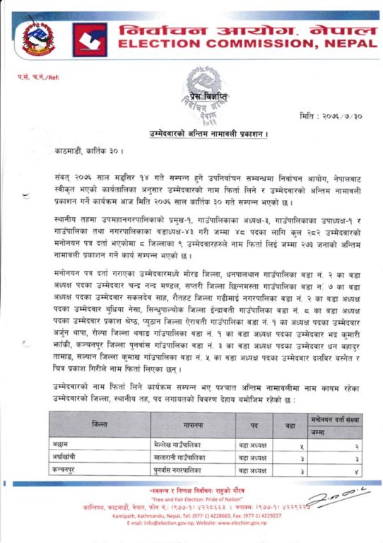 निर्वाचन आयोगको पूर्वघोषित कार्यतालिका अनुसार स्थानीय तहको उपनिर्वाचनका लागि शनिबार उम्मेदवारको अन्तिम नामावली प्रकाशन भएसँगै आइतबारबाट उम्मेदवारहरु चुनाव प्रचार अभियानमा केन्द्रित भएका छन् ।