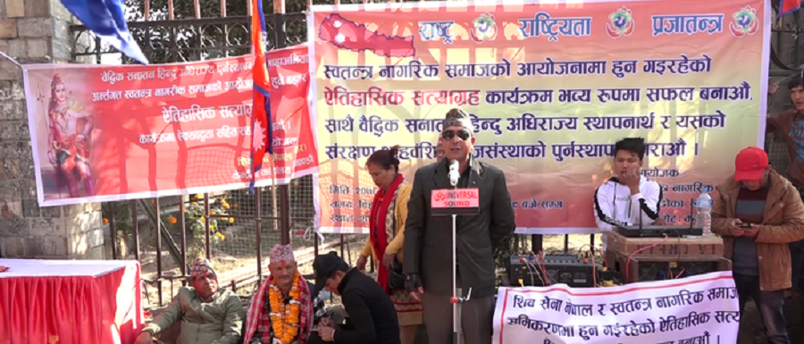 काठमाडौं । राजसंस्था र हिन्दु राष्ट्र कायम गर्न माग गर्दै काठमाडौंमा ७२ घण्टे सत्याग्रह सुरु गरिएको छ ।
