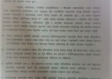 मन्त्री अर्याललार्इ ज्ञापनपत्र बुझाउदै सुगौलीसन्धिको धारा ५ का आधारमा उपलब्ध नक्सा, ऐतिहासिक दस्तावेज तथा नदी विज्ञानका आधारमा भारतसँग वार्ता गर्न नेपाल सरकारलाई आह्वान गरेका छन् ।