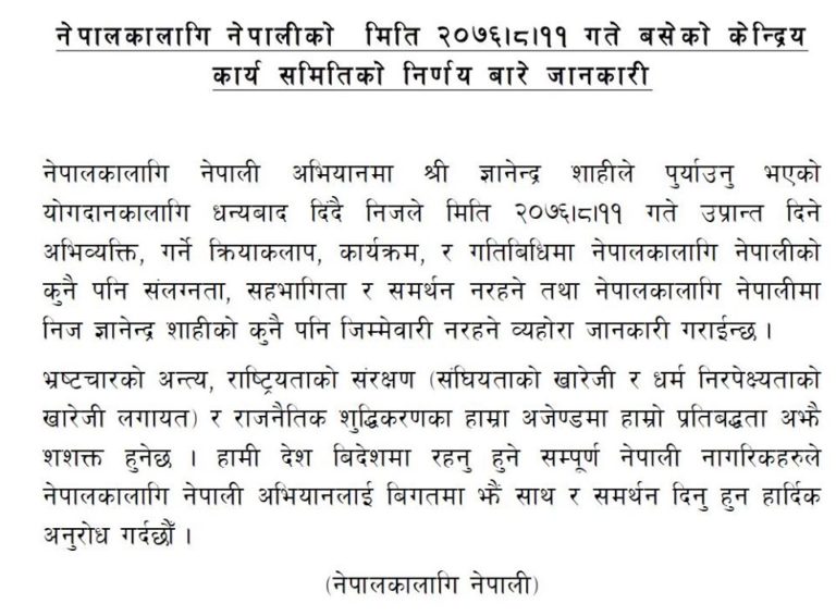 अब उप्रान्त शाहीका कुनै पनि अभिव्यक्ति र कार्यक्रममा नेपालका लागि नेपाली अभियानको संलग्नता नरहने अभियानले जनाएको छ ।