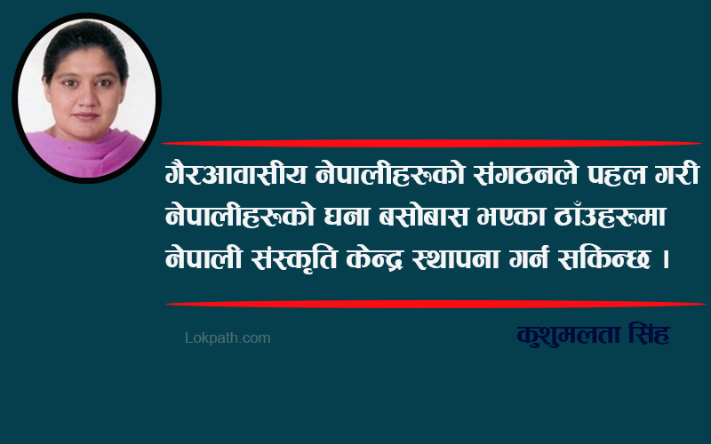 नेपाली भाषा, संस्कृति र परम्परा जोगाईराख्ने चाहना नेपालबाहिरका नेपालीहरूमा उच्च पाइन्छ । त्यसका लागि गैरआवासीय नेपालीहरूको संगठनले पहल गरी नेपालीहरूको घना बसोबास भएका ठाउँहरूमा नेपाली संस्कृति केन्द्र स्थापना गर्न सकिन्छ । त्यसमा सरकार तथा अन्य शुभेच्छुकको सहयोग जुट्नसक्छ । त्यस्ता केन्द्रमा नेपाली भाषा तथा नेपाल परिचयको शिक्षण, पुस्तकालय, साहित्य, संगीत तथा सांस्कृतिक कार्यक्रमको आयोजना आदि गर्न सकिन्छ । नेपाल नदेखेका नेपाली पुस्ताका लागि यो पहिचान बचाउने मौका र असाधारण उपहार हुनेछ । _कुशुमलता सिंह