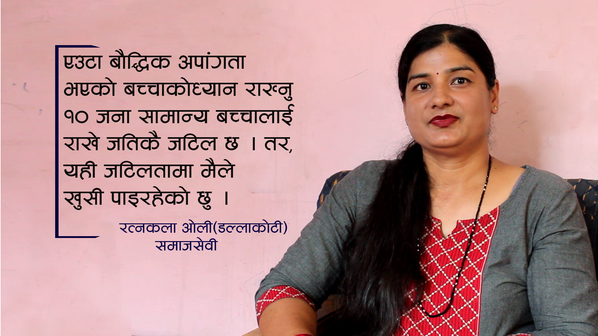 मानिसमा मानवता हराउँदै गएको यो समयमा यस्ता प्रतिप्रश्न उठ्नु स्वभाविक हो । तर आज यहाँ प्रस्तुत गर्न लागेको कथा मैले छनौट गरेका शब्दभन्दा कयौं गुणा भारी छ । यी शब्दहरुले रत्नकलाले दःुख बिसाएका ती दिनहरु र उनले व्यतीत गरेको उर्जावान् समयको हिसाबकिताब गर्न सक्लान् कि नसक्लान् म सोचमग्न छु । सुनेको मात्रै थिएँ तर देखें एउटी नारी साँच्चै भगवानको अर्को रुप हुनसक्दिरहिछन् । कसैको जन्मदाता त कसैको जीवनदाता । हो, रत्नकलाले सडकमा भेटिएका वभिन्न किसिमका शारीरिक तथा मानसिक अशक्तता, बौद्धिक अपांगता भएका बालबालिकाको जीवन धानिरहेकी छिन् ।