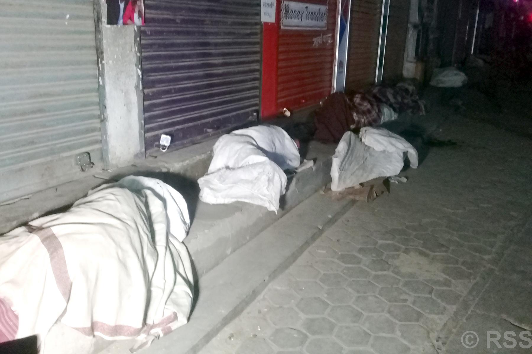उनीहरुकै भनाइमा दिनभर कुनै न कुनै काम गर्ने रात परेपछि मदिरा खाएर सडकमा सुत्ने वर्षांैदेखिको दैनिकी हो । गन्ती गर्दा यसरी लस्करै सुतेका ४३ जना भेटिए । उदयपुरका किरण र हिमाल मगर एउटै बोराभित्र हुनुहुन्थ्यो । नजीकै सिसा पसलमा काम गर्ने हिमालले यसरी सुत्नुको कारण खोल्नुभयो । उहाँले भन्नुभयो, “कसैले बस्ने कोठा दिँदैन, कोठा पाउन बूढी चाहिन्छ रे, सिसावालाले पनि बस्न दिँदैन, यहाँ नआए कहाँ जाने त ?” यति भनेपछि उहाँले मुन्टो बोराभित्र छिराउनुभयो ।