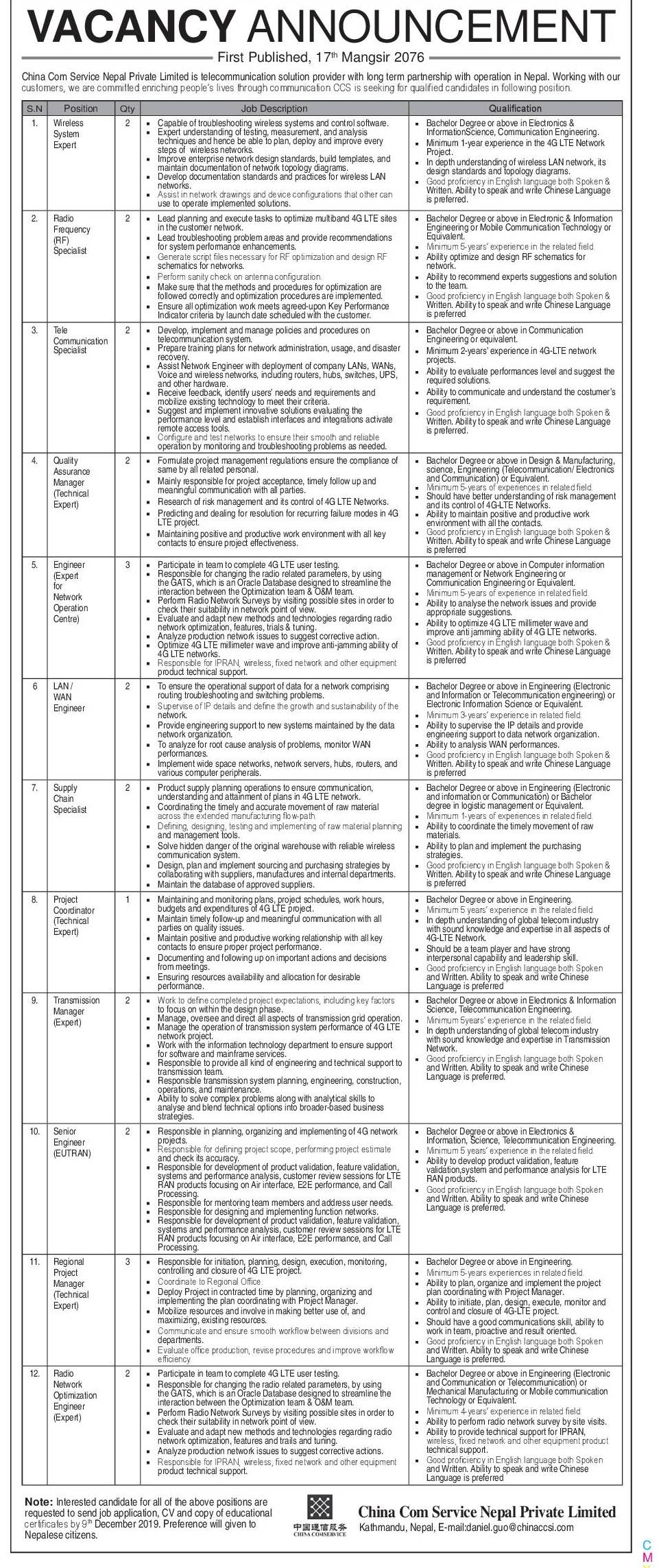 नेपालमा ‘टेलिकम्युनिकेशन प्रोभाइडर’ को रुपमा कार्यरत सो कम्पनीले दक्ष र अनुभवी कर्मचारी माग गरेको हो ।