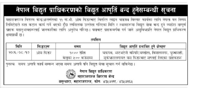 काठमाडौं । नेपाल विद्युत प्राधिकरण महाराजगञ्ज वितरण केन्द्र अन्तरर्गत ११ केभी ओम फिडरबाट वितरित लाइन चक्रपथ विस्तार कार्यको लागि नेपाल वन निगम लिमिटेडले रुख कटान गर्नको लागि आज नेपाल विद्युत प्राधिकरणले विद्युत बन्द गर्ने भएको छ ।