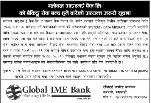 बैंकले यसबाट ग्राहकमा पर्ने असुविधानप्रति क्षमयचना गर्दै २० गतेबाट भने ग्लोबल आईएमई बैंककै नाममा एकीकृत कारोबार सुचारु गर्ने जनाएको छ ।