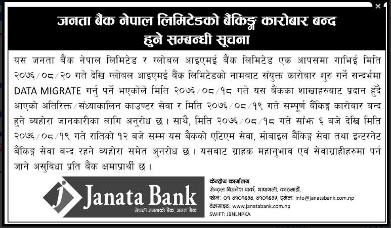 बुधबार साँझ ६ बजेदेखि बैंकको एटीमएम सेवा, क्रेडिट कार्ड सेवा, मोबाइल बैंकिङ, तथा इन्टरनेट बैंकिङ सेवा बन्द हुने तथा बिहीबार बैंकका सबैखाले सेवा बन्द रहने सूचनामा जनाइएको छ ।