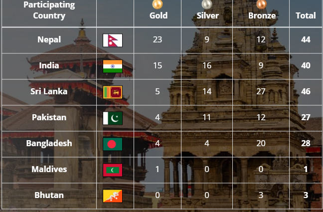नेपालले भारतभन्दा ८ वटा बढी पदक जितेको छ । भारतले १५ स्वर्ण जित्दा १६ रजत र ९ काँस्य पनि जितेको छ । यस्तै श्रीलंकाले ५ स्वर्ण, १४ रजत र २७ कास्य जितेको छ ।
