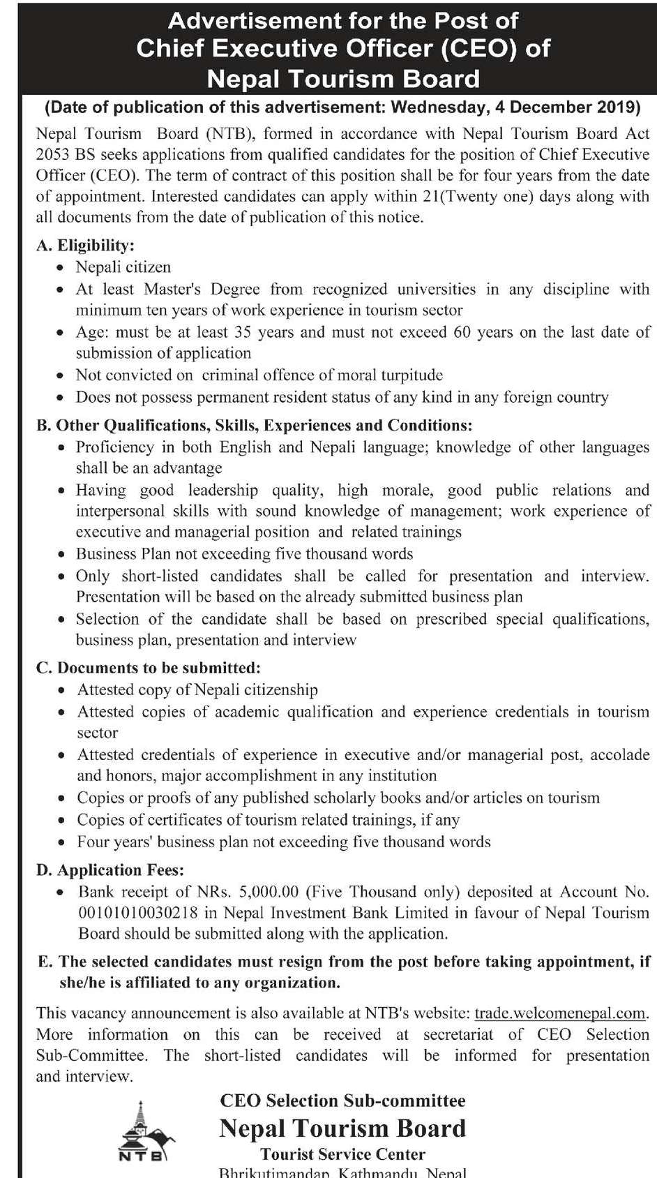 पर्यटन बोर्डको सीईयोको लागि दरखास्त आह्वान