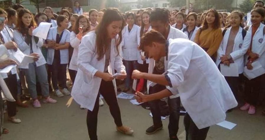 बिहीबारदेखि हुने परीक्षा बहिष्कार गर्ने घोषणा गर्दै नेपाल मेडिकल कलेज, चितवन मेडिकल कलेज, युनिभर्सल मेडिकल कलेजका विद्यार्थीले प्रवेश पत्र जलाएका हुन् ।