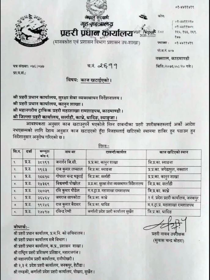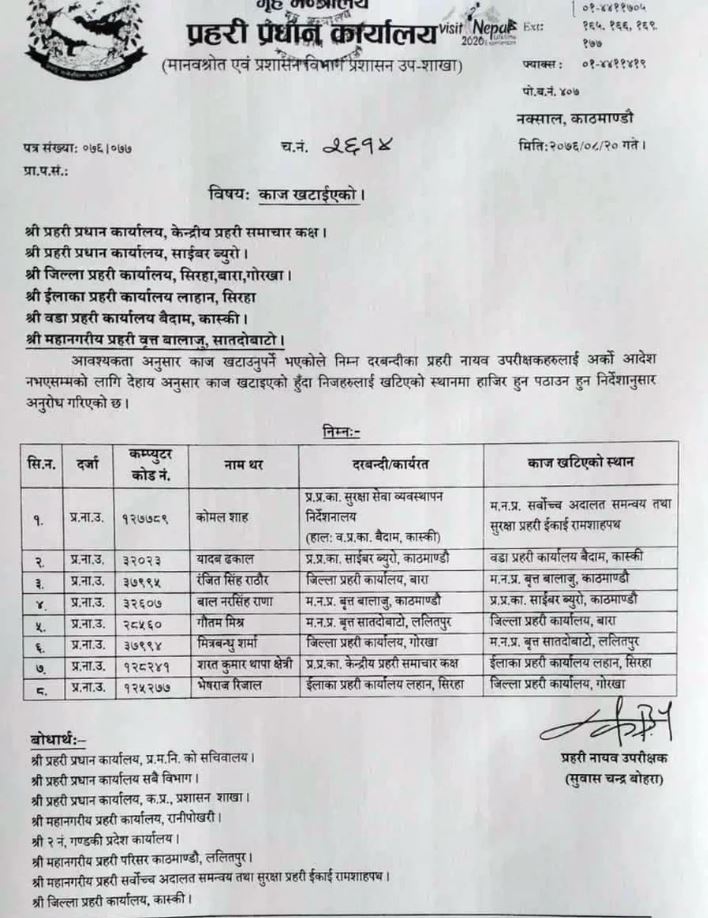 यसैगरी सर्लाहीका गोपाल चन्द्र भट्टराई प्रहरी प्रधान कार्यालयको कानुन शाखामा सुरुवा भएका छन् । सुरक्षा सेवा व्यवस्थापन निर्देशनालयका विश्वमणि पोखरेललाई जिल्ला प्रहरी कार्यालय सर्लाहीमा पठाइएको छ ।
