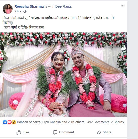 ऋचाले सामाजिक सञ्जाल फेसबुकमा विवाहको तस्विर सेयर गरेकी छिन् । उनको तस्विरमा शुभचिन्तकहरुले उनलाई विवाहको शुभकामना दिएका छन्।