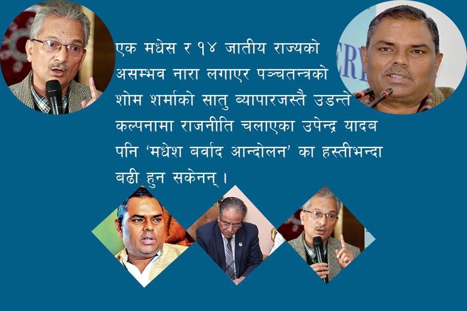 ‘एक मधेस एक प्रदेश’ सहित मुलुकलाई १४ वटा जातीय राज्यमा विभाजित गर्नुपर्ने ‘सैद्धान्तिक धरातल’ (?) मा घाटघाटको पानी पिउँदै उपेन्द्र यादबको ‘संघीय समाजवादी पार्टी’मा पत्नीसँगै ओत लाग्न पुगेका छन्, १० वर्षे हिंसाचारका ‘अग्रणी सिद्धान्तकार तथा रणनीतिकार’ डा. बाबुराम भट्टराई । एक मधेस र १४ जातीय राज्यको असम्भव नारा लगाएर पञ्चतन्त्रको शोम शर्माको सातु ब्यापारजस्तै उडन्ते कल्पनामा राजनीति चलाएका उपेन्द्र यादब पनि ‘मधेश बर्वाद आन्दोलन’ का हस्तीभन्दा बढी हुन सकेनन् । त्यसैमाथि थपिएका छन् काँग्रेस, एमाले, माओवादी, राप्रपा र अन्य पार्टीबाट चोइटिएका, उछिट्टिएका, गलहत्याईएका, ४ जनाले नपत्याएका धेरै सफेदपोश मनुवाहरू । मधेशी जनअधिकार फोरम नामको एउटा एनजीओ खोलेर त्यसैलाई पार्टी बनाएका उपेन्द्र यादब मधेशको यस्तो राजनीति गर्दैछन्, मानौँ उनी यस अघि सत्तामा बसेकै थिएनन् । यसरी आफूमा दायित्वबोध नभएको जस्तो विद्रोही राजनीति चलाइरहेका छन् यी पूर्व उपप्रधानमन्त्री तथा कानुन मन्त्री ।