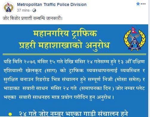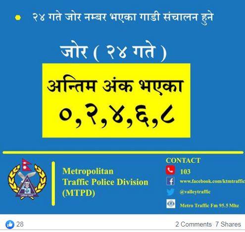 सागको अन्तिम दिन सवारीसाधनमा जोर विजोर प्रणाली लागु गरिने भएको छ । महानगरिय ट्राफिक प्रहरी महाशाखाले एक सुचना जारी गर्दै उक्त दिन सवारीसाधन जामलाई न्युनिकरण गर्न उक्त प्रणाली लागु गर्न लगिएको जनाएको छ ।