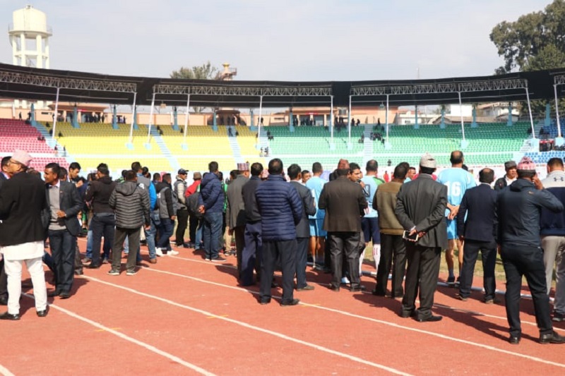 पुरुष फुटबलको फाइनल खेलअघि राष्ट्रिय खेलकुद परिषद (राखेप) ले रंगशालामा मैत्रीपूर्ण फुटबल राखेपछि फाइनल खेलका म्याच कमिस्नारले असन्तुष्टि जनाएका छन् ।
