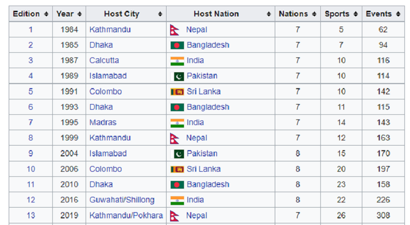 दक्षिण एसियाली राष्ट्रलाई खेलकुदको माध्यमबाट जोड्ने उद्वेश्यकले सन् १९८४ मा सागको सुरुवात नेपालबाट भएको थियो । सन् १९९९ मा सागको दोस्रो पटक आयोजना गरेको थियो ।
