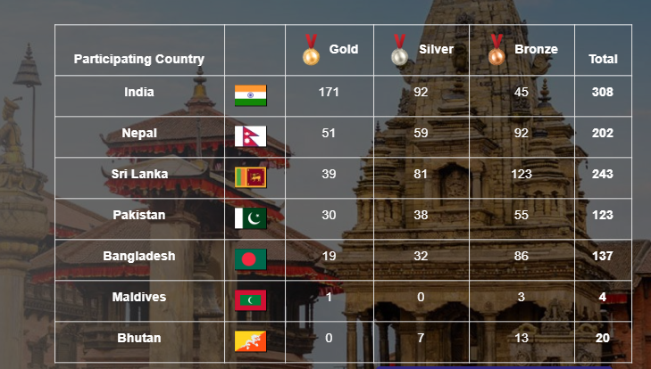 अन्तिम दिनसम्म भारत १ सय ७१ स्वर्ण सहित पदक तालिकामा अगाडी छ । आयोजक नेपाल ५१ स्वर्ण पदक सहित दोस्रो स्थानमा छ ।